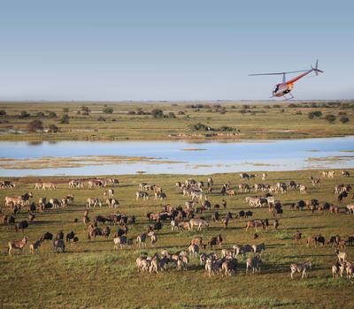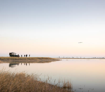 the lesser and greater flamingos. These flying flame birds, arrive in their millions during seasons of good rain, when millions of small shrimp and other crustaceans crack through the salty pan crust to spawn. The result, a pink extravaganza in the heat of the desert. You can also heli to Sua Pan to view the flamingos in Mar - Apr (scenic helicopter flight must be booked at an additional cost).
