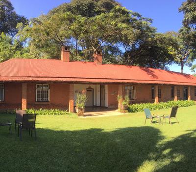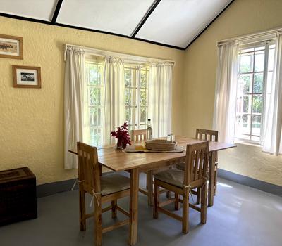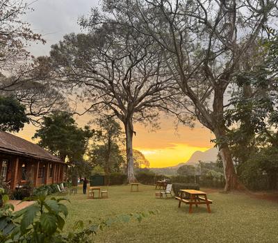 Restaurant table in the garden, Mulanje Mountain view