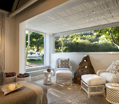 A partially open dual treatment room with views of the spa gardens